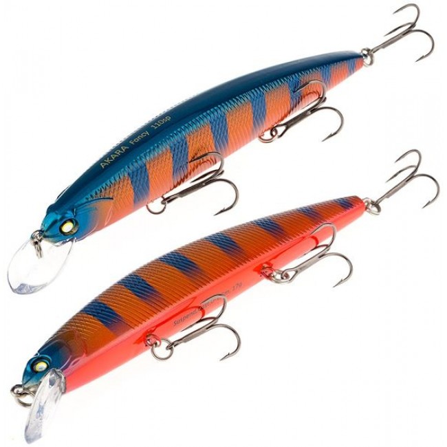 Akara Fancy - классический воблер суспендер для ловли твичингом. Его длина 110 мм с заглублением до 1,5 метров, позволяет ловить щуку и других хищников в типичных местах ловли. При весе 17 грамм, он прекрасно забрасывается и позволяет рыбаку облавливать большие площади. Разнообразные цвета, позволят выбрать приманку для любых условий ловли. Суспендер. Заглубление при кастинге от 0 до 1,5м.
