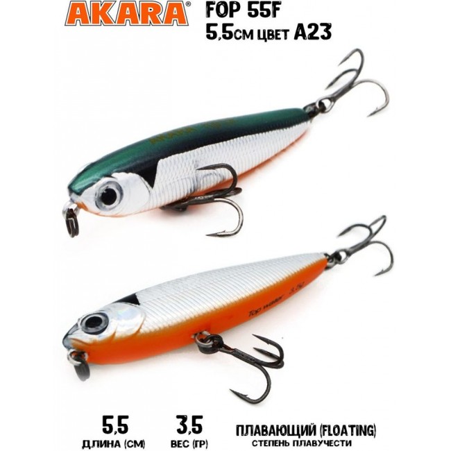 Akara Fop – плавающий волкер. Благодаря компактной торпедообразной форме имеет отличные полетные характеристики. Рекомендуется проводить данный волкер рывковой проводкой. Характерная игра приманки на поверхности воды привлекает рыбу с больших дистанций. Подходит для ловли щуки, окуня, жереха и др. Устойчиво работает на водоемах разных типов. Оснащен крючками из высоколегированной стали. Поверхностный.