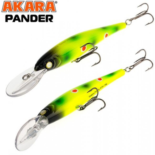 Akara Pander 105F - классический воблер, рассчитанный на ловлю троллингом. Применяется для ловли любой хищной рыбы на глубинах до 5 метров. Обладает, хаотичной, рыскающей игрой, похожей на движения раненой рыбки. Широкий ряд оригинальных расцветок позволяют подобрать модель под любые условия ловли. Плавающий. Заглубление при троллинге от 4 до 5 м.