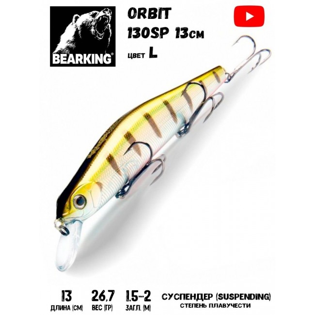 Воблер BearKing Orbit 130 является высококачественной репликой ZipBaits Orbit 130, выпущенный компанией Беркинг в начале 2020 г. Длина воблера составляет 130 мм., вес около 27гр. Приманка совершенно не упориста за счет своей узкой лопатки. Плавучесть заявлена как суспендер, но если использовать более тяжелые поводки, можно сделать воблер медленно тонущим. Воблер бесшумный, имеет такую же систему дальнего заброса, как и оригинал. Рабочая глубина приманки от 1,2 до 1,8 метра, что позволяет использовать воблер на глубине до 3 метров. Способ анимации - твичинг, так же можно использовать равномерную проводку. Работает весь сезон открытой воды, но лучше всего использовать его в период осеннего жора хищника. Отличная альтернатива дорогим японским приманкам за адекватную стоимость.