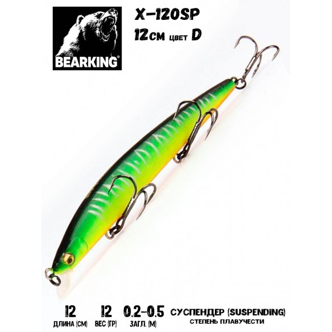 Беркинг X - 120SP - это копия Megabass X-120SP. Длина воблера - 120 мм, вес - 12 грамм. Тип плавучести — медленно всплывающий, с более тяжелым поводком — суспендер. Рабочая глубина от 0,2 до 0,5 метров. Способ анимации — только твичинг, поскольку на равномерной проводке Х - 120 практически не имеет собственной игры. Отлично держит струю, поэтому приманку можно использовать как на течении, так и на водоемах со стоячей водой. Полетные качества за счет своего удлиненного тела и правильной огрузки — отличные. Применяется летом на мелководных и заросших участках для ловли щуки и крупного окуня.